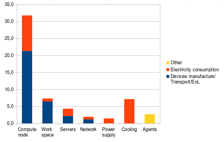 Our analysis estimated the carbon footprint at 3.6 g CO₂e per core.hour for 2024, including hardware manufacture, transport, End of Life stage and electricity consumption but also agents impact, see Table 1 and Figure 1 for details.